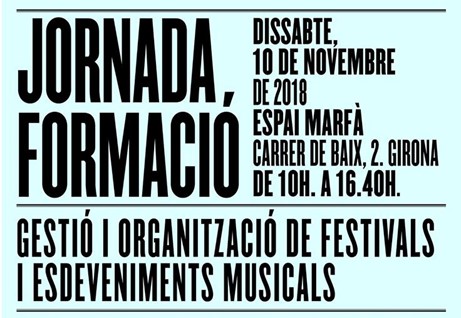 Aquest dissabte 10 de novembre, l'Associació Xàfec, que agrupa diversos festivals d'arreu de Catalunya, organitza una jornada sobre gestió i organització de festivals.Dirigida a organitzadors, promotors i altres professionals del sector de la música, comptarà amb xerrades sobre la recerca depatrocinis, el programa d'acompanyament artístic de l'Espai Marfà, els públics, a més de showcases com el de Carmen 113, entre d'altres. Per a més informació i inscripcions: www.girona.cat/marfa