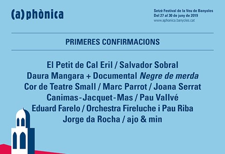 El Festival de la Veu de Banyoles, (a)phònica, avança alguns dels noms que formaran part del cartell de la setzena edició, que tindrà lloc del 27 al 30 de juny, en espera de presentar tota la programació a finals de maig. Entre els artistes confirmats destaquen l’estrena oficial del nou projecte de l’Orchestra Fireluche i Pau Riba, Marc Parrot, la producció pròpia del festival Canimas – Jacquet - Mas, Pau Vallvé, Joana Serrat, Eduard Farelo amb Una ilíada, Daura Mangara + Documental Negre de merda, ajo & min, Jorge da Rocha, i Cor de Teatre Small amb No se n’ha parlat prou.
